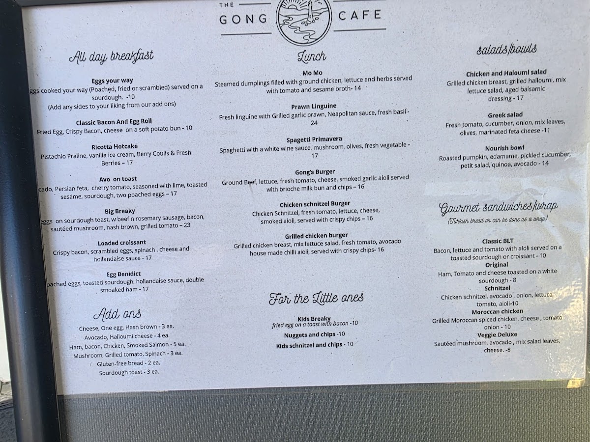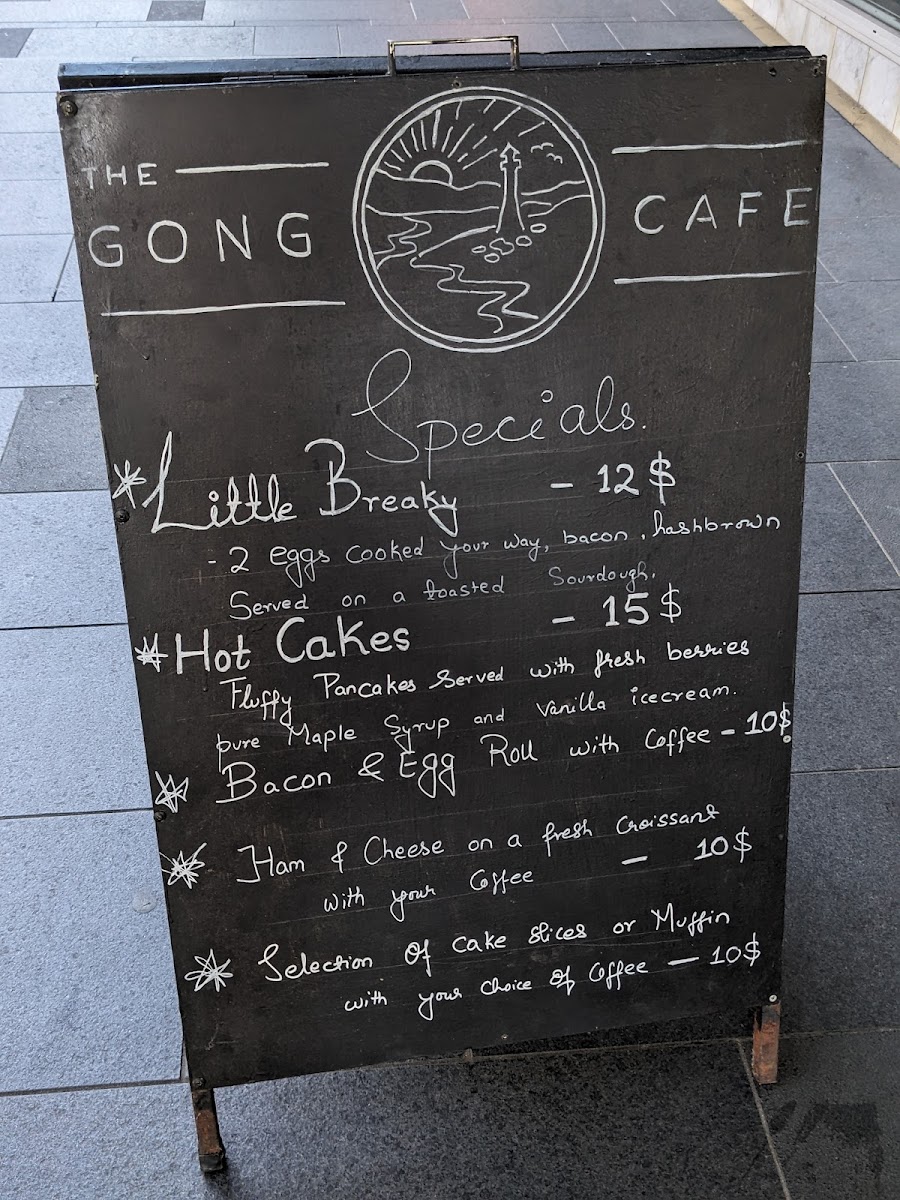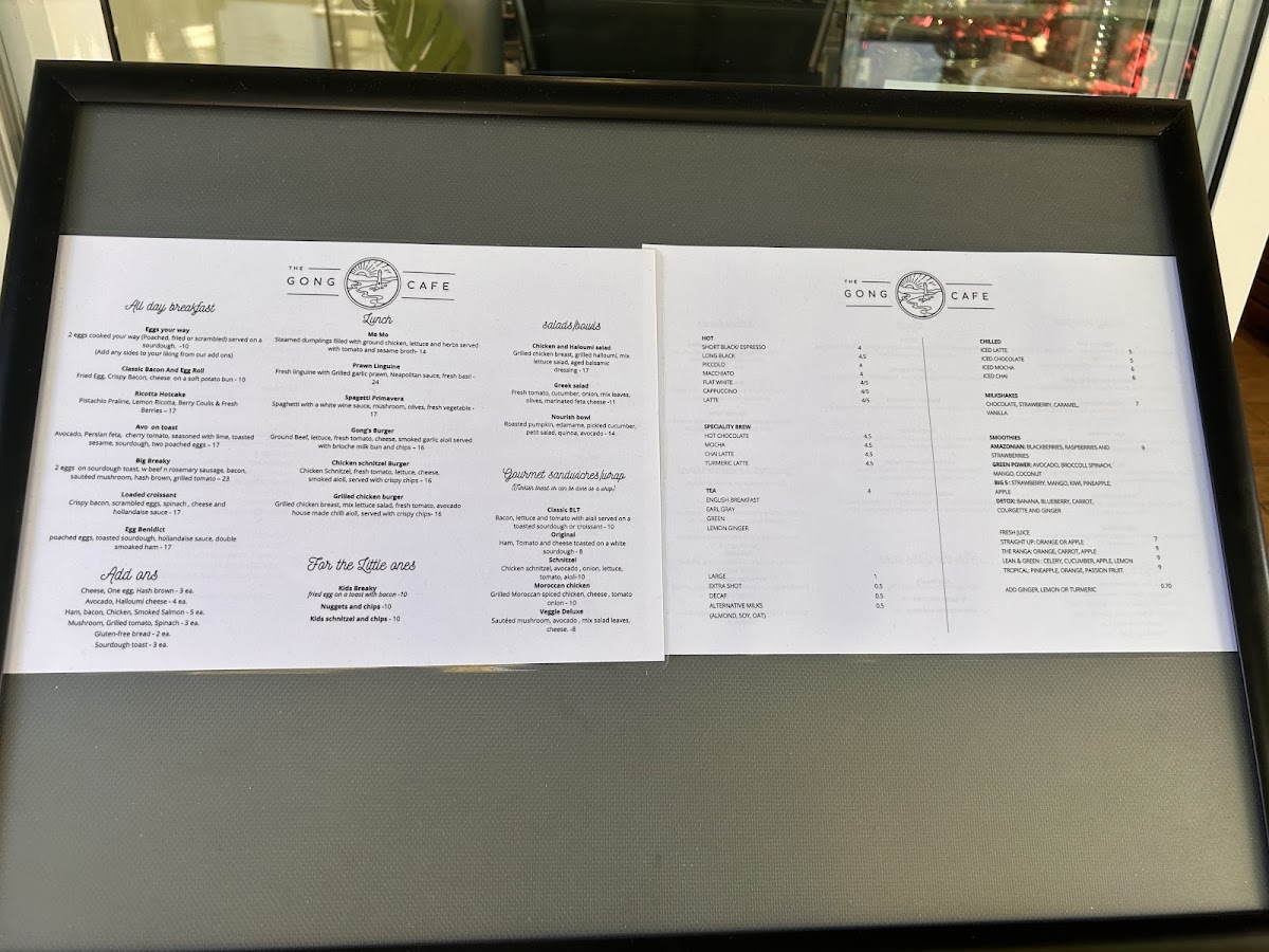 From a reviewer’s perspective, the menu at The Gong Cafe offers a well-rounded and thoughtfully curated selection that caters to a wide range of tastes, making it an ideal spot for both casual diners and café lovers. The all-day breakfast lineup sets a comforting tone, with classics like Eggs Your Way, Classic Bacon And Egg Roll, Ricotta Hotcake, Avo On Toast, and the hearty Big Breaky, all designed to satisfy from morning through midday. Moving into lunch, the menu confidently expands with flavorful and filling options such as Mo Mo, Prawn Linguine, Spagetti Primavera, Gong's Burger, and Chicken Schnitzel Burger, blending café-style comfort with more substantial meals.